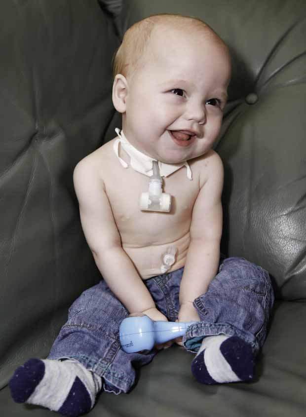 Keelan-John Owen-Marston nasceu Novembro passado e nada podia prever o que vinha depois. Este corajoso bebê nasceu com um problema de saúde denominado Anomalias congénitas da laringe. De forma resumida isto provoca uma abertura entre o esófago e traqueia que por sua vez permitia que os liquidos e sólidos passassem para as vias respiratórias, criando sério problemas de respiração e impedindo que bebê que chorasse.